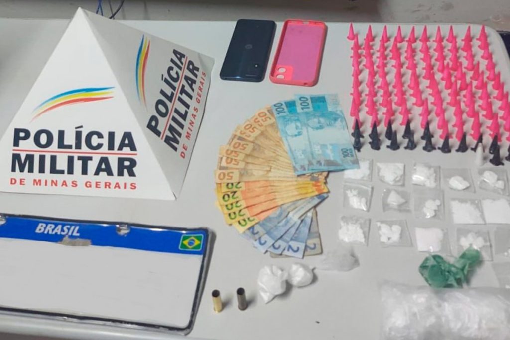 Durante diligências, o autor foi encontrado em sua casa, e estava com uma sacola verde em uma das mãos e na outra um revólver. Ele deu início à fuga novamente, mas após intenso rastreamento, foi localizado em um matagal, onde foi abordado. Com o autor foram localizados: 123 (cento e vinte e três) pinos e 22 (vinte e duas) porções de cocaína; 1 (uma) porção de maconha; vários sacos plásticos vazios – geralmente utilizados para embalar entorpecentes; 2 (dois) cartuchos deflagrados do calibre.38; R$710,00 (setecentos e dez reais) e 1 (uma) chave de motocicleta.