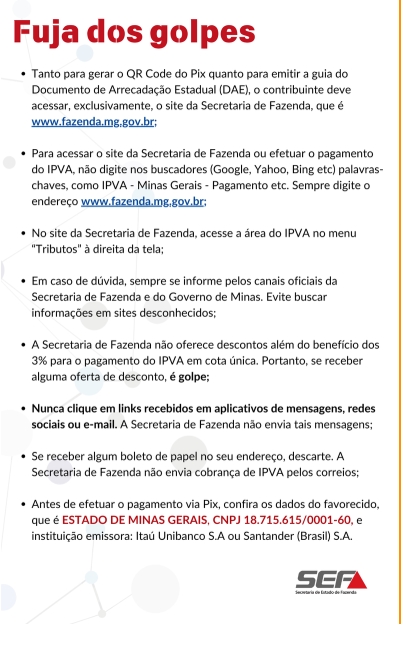 A Secretaria de Estado de Fazenda de Minas Gerais (SEF/MG) publicou nesta sexta-feira (27/12), o calendário de vencimentos e as regras do Imposto sobre a Propriedade de Veículos Automotores (IPVA) para 2025. O tributo passa a ser cobrado em fevereiro pelo Governo de Minas, dando mais fôlego às famílias mineiras no início do ano, quando há diversas outras despesas e contas para pagar.