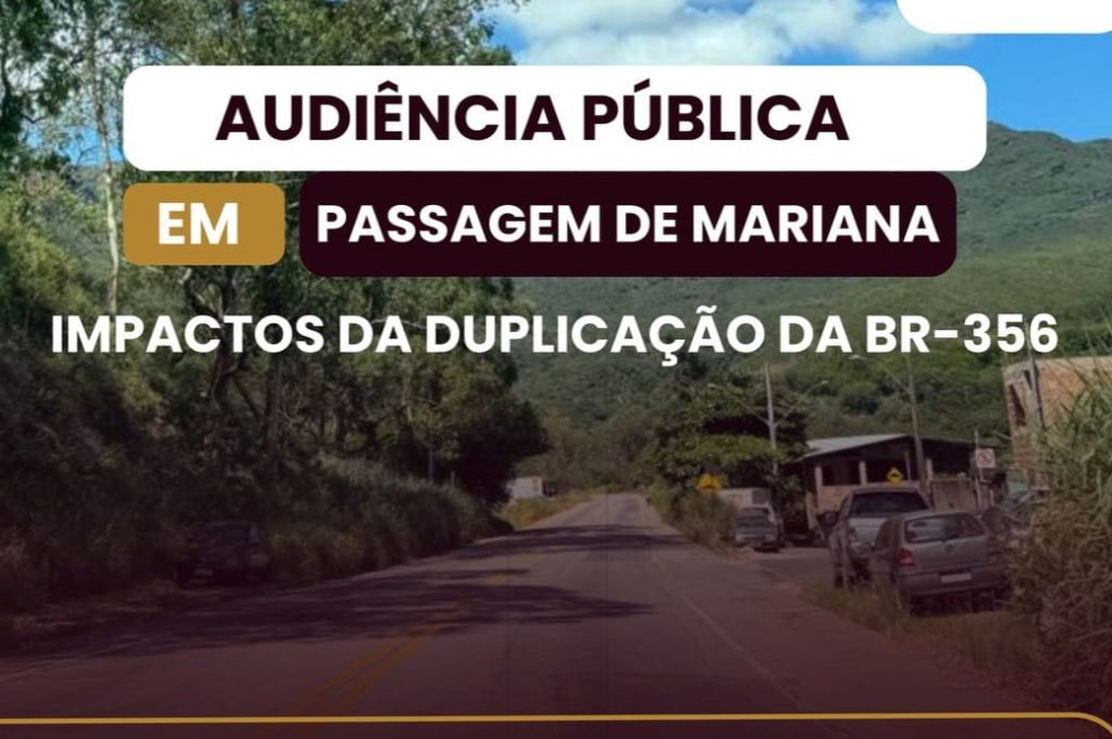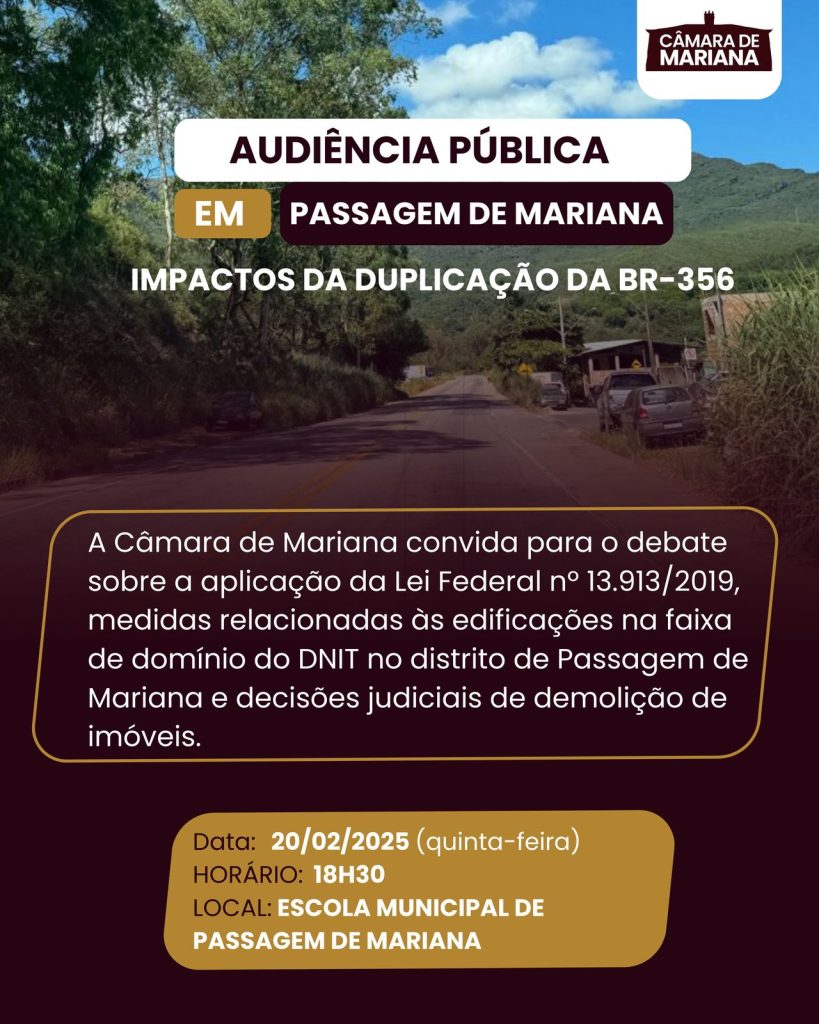 Acontecerá dia 20 de fevereiro de 2025 as 18:30 uma audiência pública na escola Municipal de Passagem de Mariana com assunto principal sobre os impactos da duplicação da BR 356 na Vila São Vicente.