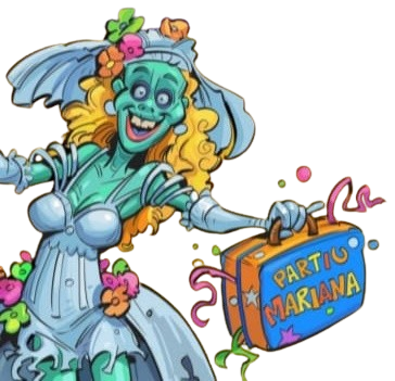 Como é : È uma moça muito bonita, que aparece vestida de noiva, com uma tiara branca com flores no cabelo.