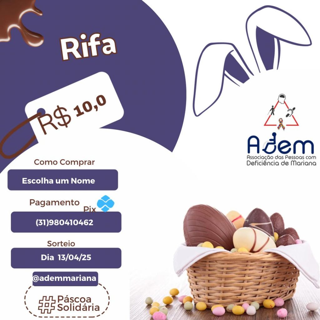 A associação de pessoas com deficiência de Mariana promove uma rifa em prol de suas atividades. Quem se interessar entrar em contato pelo número do cartaz. O prêmio da rifa é uma cesta básica.