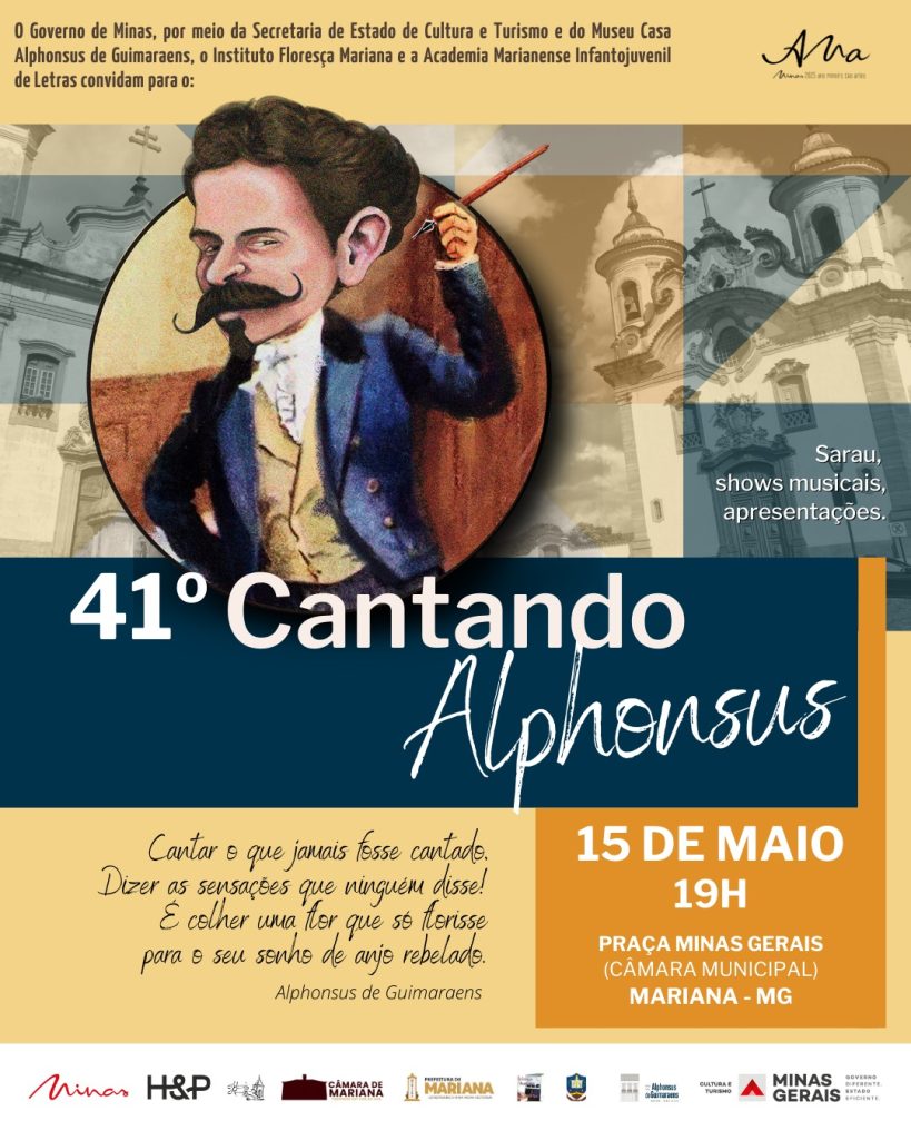 Dia 15 de maio às 19hs acontecerá o Cantando Alphonsus na Praça Minas Gerais em frente a Câmara de Mariana. Esse ano conta com a participação de escolas de Mariana e Região, além de instituições culturais e da comunidade.