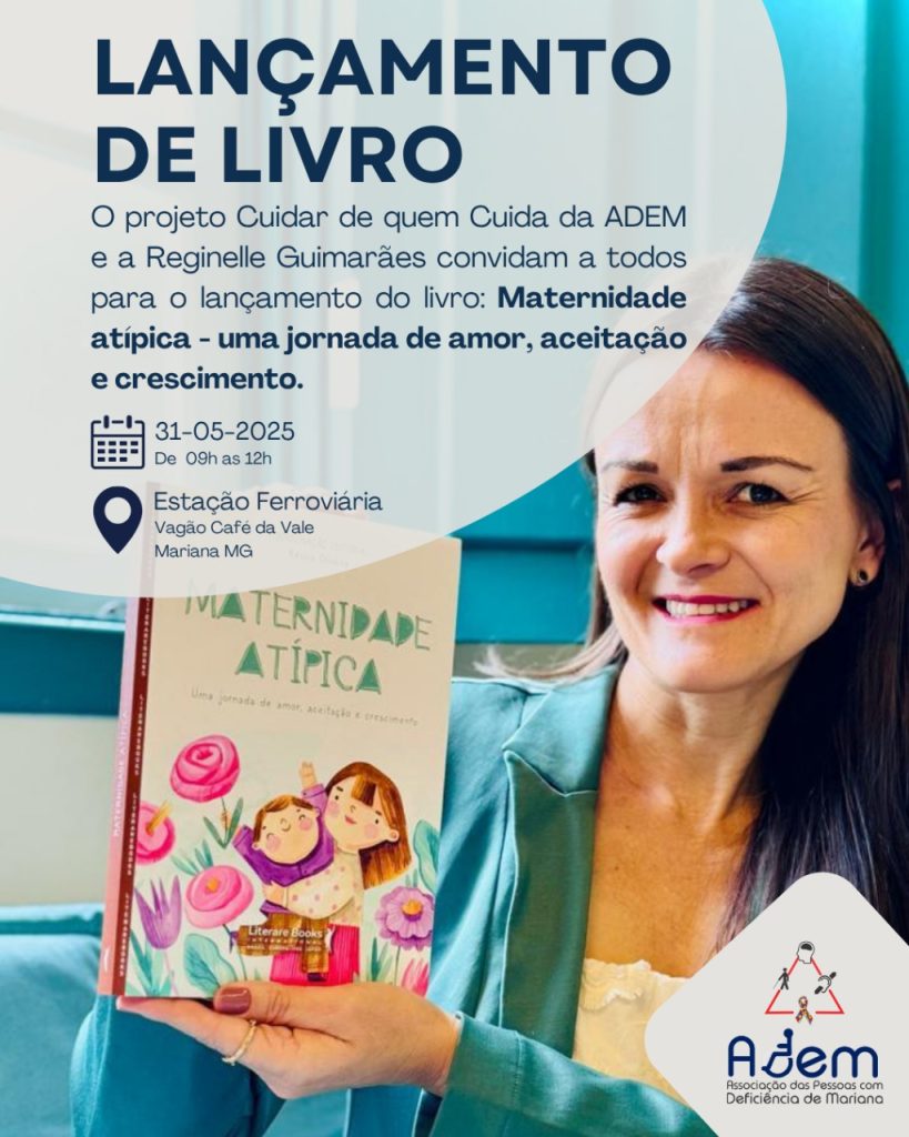 A cidade de Mariana receberá no próximo dia 31 de maio, das 9h às 12h, o lançamento do livro Maternidade Atípica – uma jornada de amor, aceitação e crescimento, da autora Reginelle Guimarães. O evento será realizado no Vagão Café da Vale, na Estação Ferroviária, e é promovido pelo projeto “Cuidar de quem Cuida”, da Associação das Pessoas com Deficiência de Mariana (ADEM).