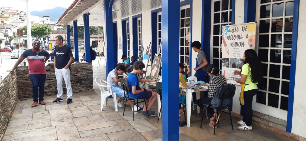 Os alunos montaram os cavaletes em frente ao Terminal e sobre a supervisão de Geraldino e Arlindo Flausino realizaram pinturas sobre tela.