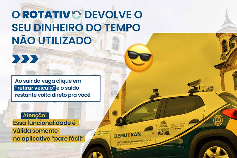 Buscando melhorias nas funcionalidades dos estacionamentos, a Prefeitura de Mariana, por meio da Secretaria de Segurança Pública, realizou uma mudança no aplicativo “Pare Fácil”, que agora permite o resgate do valor correspondente ao tempo de estacionamento não utilizado. O aplicativo, disponível para download na Apple Store e na Play Store, ficou ainda mais prático e eficiente para os usuários. Ao sair da vaga, basta clicar em “retirar veículo” e o saldo restante será automaticamente devolvido ao cadastro do condutor.