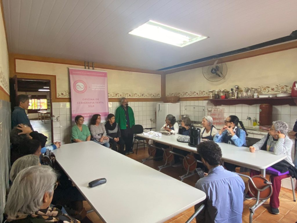 O encontro reuniu também as participantes do Movimento Renovador de Mariana para o curso de serigrafia têxtil da instituição — técnica de impressão que transfere tinta para o tecido por meio de uma tela, criando peças únicas e artesanais.