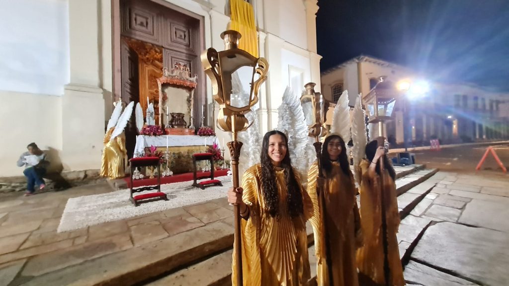 Para a celebração de Corpus Christi em Mariana foram feitos lindos tapetes de serragem e outros materiais pelas ruas, e também contou com a presença de figurantes, como acima vemos moças vestidas de anjos.