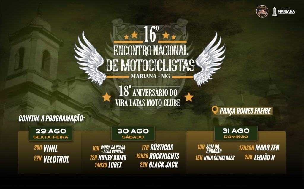 No final de semana dos dias 29, 30 e 31 agosto, Mariana será sede do 16º Encontro Nacional de Motociclistas, realizado em conjunto com a comemoração do 18º Aniversário do Vira Latas Moto Clube.