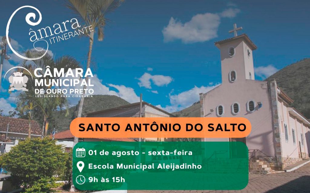 A primeira edição do programa Câmara Itinerante após o recesso parlamentar será realizada no distrito de Santo Antônio do Salto, na sexta-feira, 1º de agosto, na Escola Municipal Aleijadinho, das 9h às 15h.