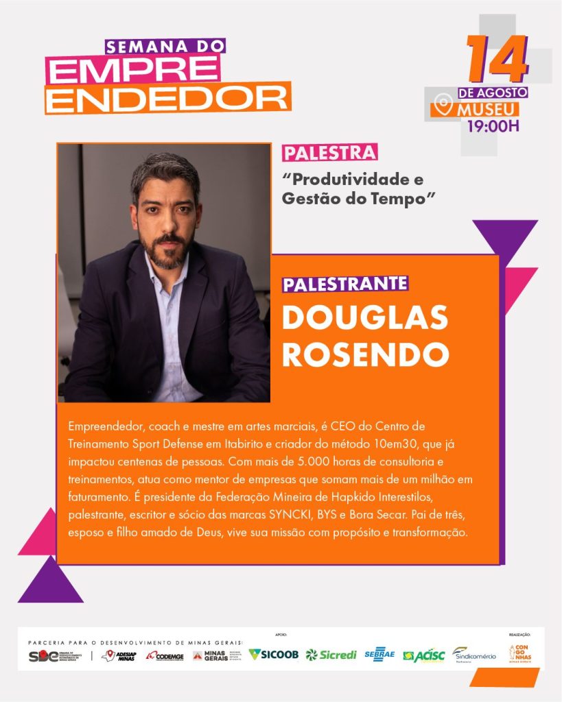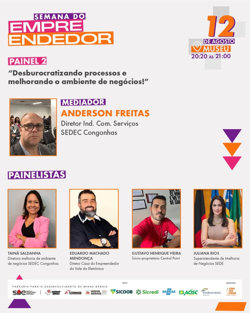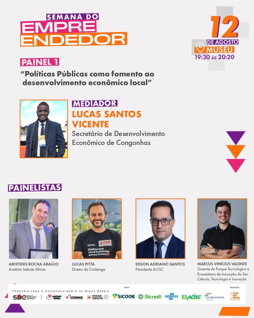 Durante três dias, a Semana do Empreendedor oferece uma programação voltada à qualificação, negócios e fortalecimento do ambiente empresarial, como os painéis: “Políticas públicas como fomento ao desenvolvimento econômico local” e “Desburocratizando processos e melhorando o ambiente de negócios”, com representantes do Sebrae, Codemge, ACISC e Secretaria de Ciência, Tecnologia e Inovação.