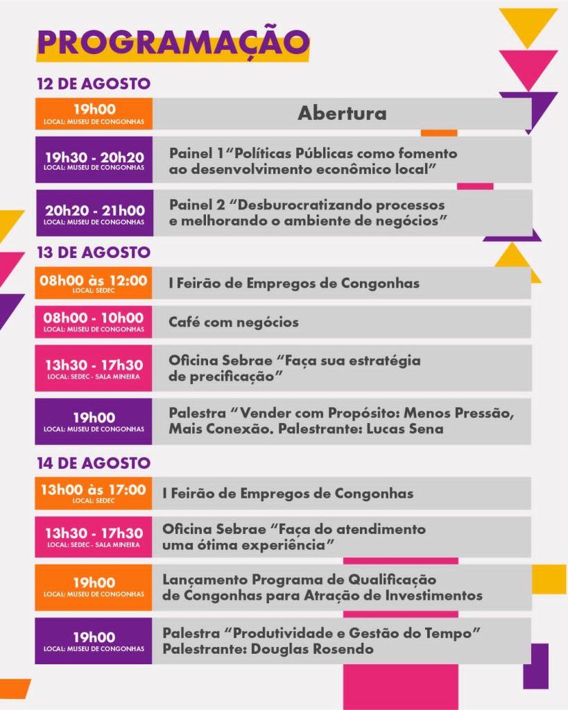 Na terça-feira (13), haverá o Feirão de Empregos na SEDEC, Café com Negócios no Museu, oficina “Faça sua estratégia de precificação” (Sebrae) e palestra de Lucas Sena: “Vender com Propósito: Menos Pressão, Mais Conexão”. Na quarta-feira (14), acontece a oficina “Faça do atendimento uma ótima experiência” (Sebrae), lançamento do Programa de Qualificação de Congonhas para Atração de Investimentos e palestra de Douglas Rosendo: “Produtividade e Gestão do Tempo”.