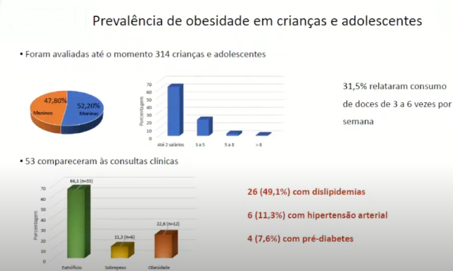 Em outra etapa do projeto, que avaliou 349 adolescentes entre 11 e 15 anos de idade de nove escolas municipais, 29,7% estavam acima do peso, sendo 57,7% com sobrepeso e 42,3% com obesidade.
