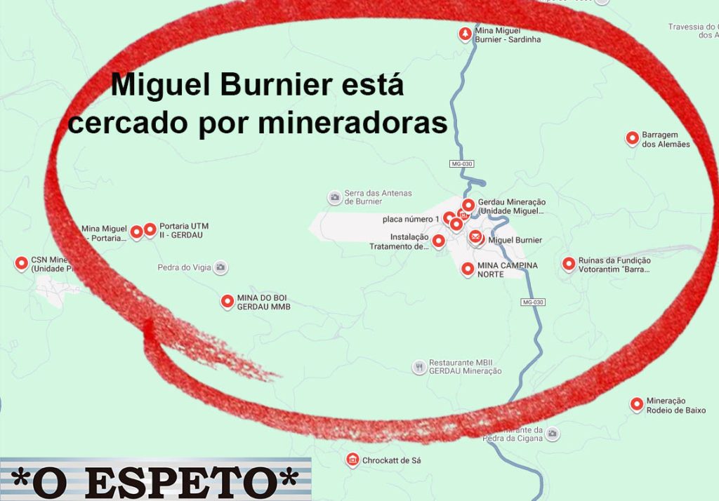 Miguel Burnier: 700 moradores em meio a mineração. Três mineradoras já mineram em Miguel Burnier : Ferro Mais, Mineração Rodeio de Baixo, Gerdau.