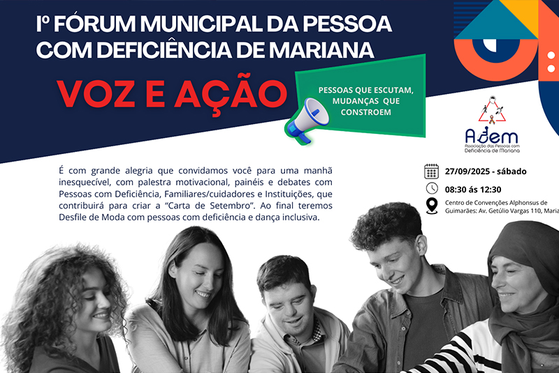 No próximo sábado, 27 de setembro de 2025, a cidade de Mariana recebe o 1º Fórum Municipal da Pessoa com Deficiência – Voz e Ação, uma iniciativa da Associação das Pessoas com Deficiência de Mariana (ADEM). O evento será realizado no Centro de Convenções Alphonsus de Guimarães (Av. Getúlio Vargas, 110), das 8h30 às 12h30.