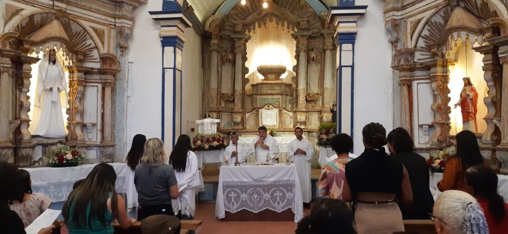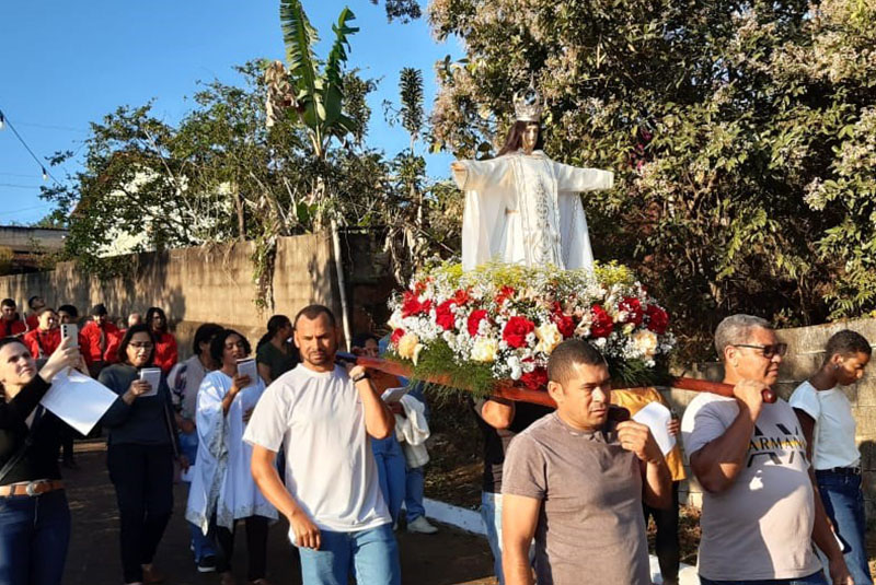 A procissão saiu da Casa da Sra. Terezinha, percorreu as principais ruas do antigo povoado para a Igreja das Mercês, onde foi celebrada uma missa pelo Padre Marcelo Santiago.