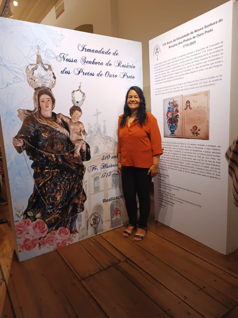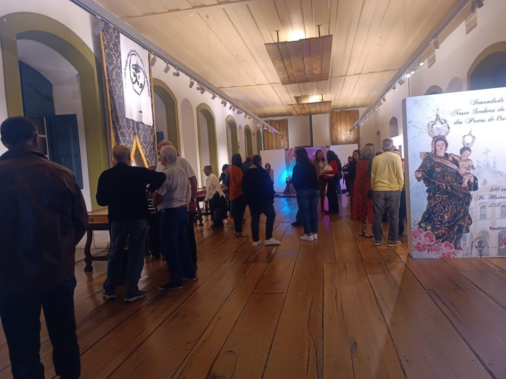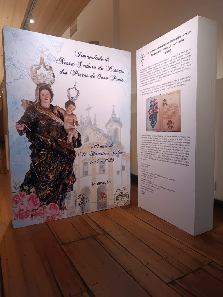 Fundada originalmente no Rio de Janeiro em 1683, a Irmandade de Nossa Senhora do Rosário dos Pretos estabeleceu-se em Vila Rica em 1715. Desde então, tem sido símbolo de fé e resistência, tendo entre seus princípios a união, a solidariedade e o amparo espiritual aos seus membros. Como destaca um dos registros históricos apresentados na exposição, “a Irmandade de Nossa Senhora do Rosário é, e foi sempre, venerada e protegida não só pelos Sumos Pontífices Romanos, como por todos os monarcas católicos, enriquecendo-a com indulgências e graças aplicadas a todos os seus irmãos e confrades”.