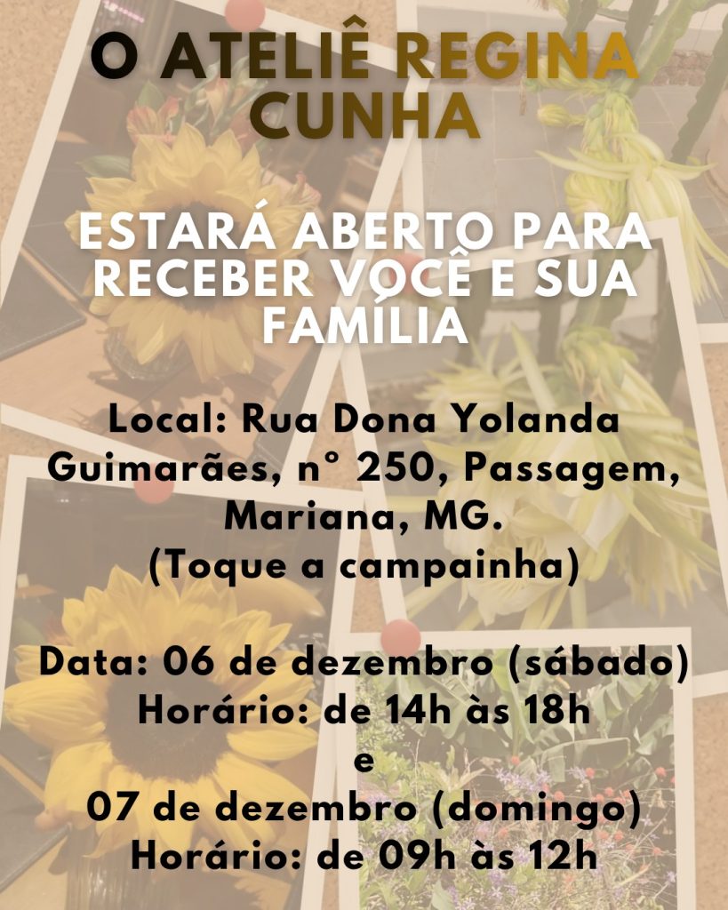 Dias 06 e 07 de dezembro de 2025 a artista Regina Cunha abrirá seu atelier para receber o público que terá a oportunidade de conhecer e admirar sua arte, tanto em cerâmica como em outros materiais.