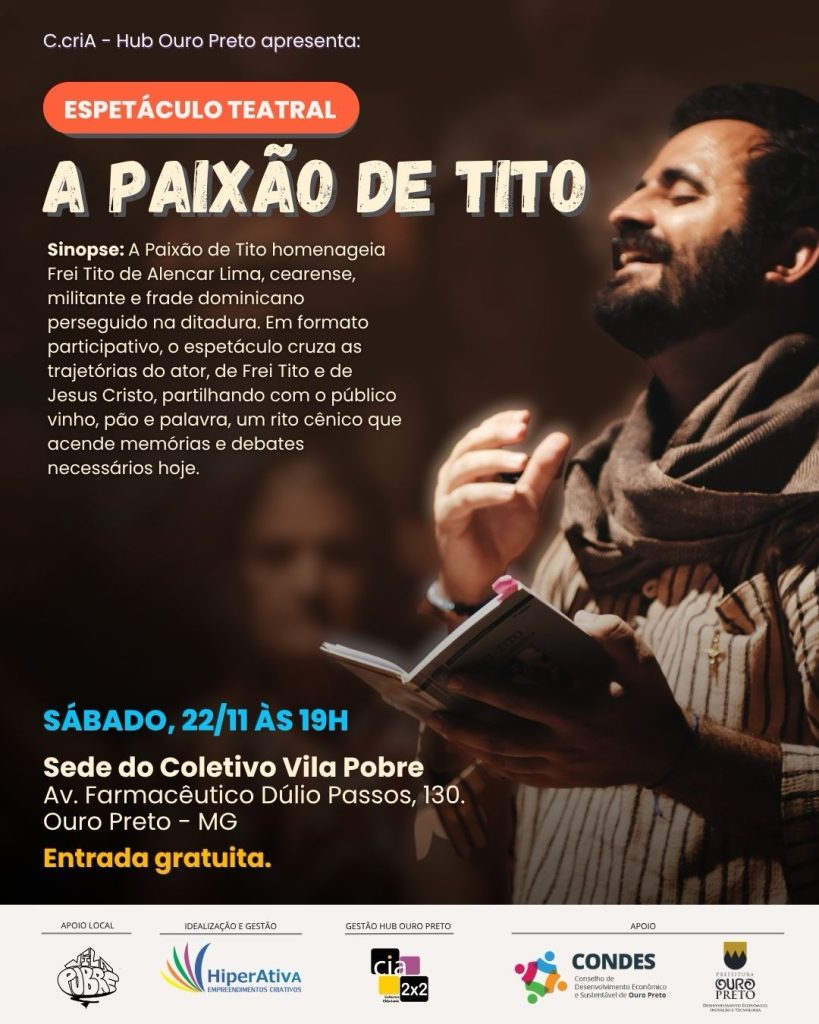 A obra presta homenagem à trajetória de Frei Tito de Alencar Lima, figura marcada pela luta política, pela resistência e pelo legado humanista. Cearense, militante e frade dominicano, Frei Tito foi preso, torturado e posteriormente banido do Brasil durante a Ditadura Militar. Em cena, o espetáculo envolve o público em um ritual performativo que revisita os principais capítulos da vida do religioso, da infância ao exílio, que culminou em sua morte aos 29 anos de idade.