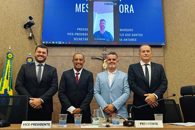 Foram empossados para a Mesa Diretora 2026 os vereadores Léo do Social (PSDB), no cargo de presidente; Danilo Grilo (Cidadania), como vice-presidente; e Fernando da Sheila (Mobiliza), como secretário. O vereador Fernando participou da solenidade de forma remota, realizando a assinatura do termo de posse de maneira digital.