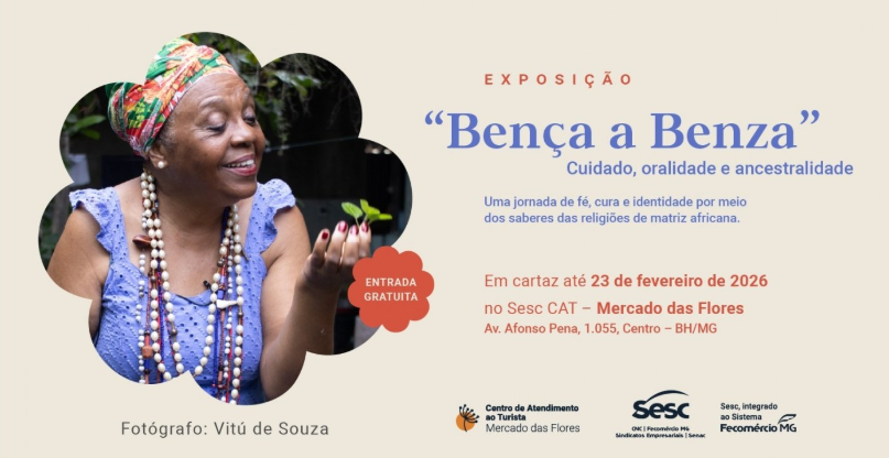 A exposição “Bença a Benza”, em cartaz no Sesc Mercado das Flores em Belo Horizonte até 23 fevereiro de 2026, apresenta fotografias, oficinas de contação de histórias e vivências com plantas medicinais, aproximando o público da profundidade desse saber popular e destacando o valor histórico e antropológico da benzição.