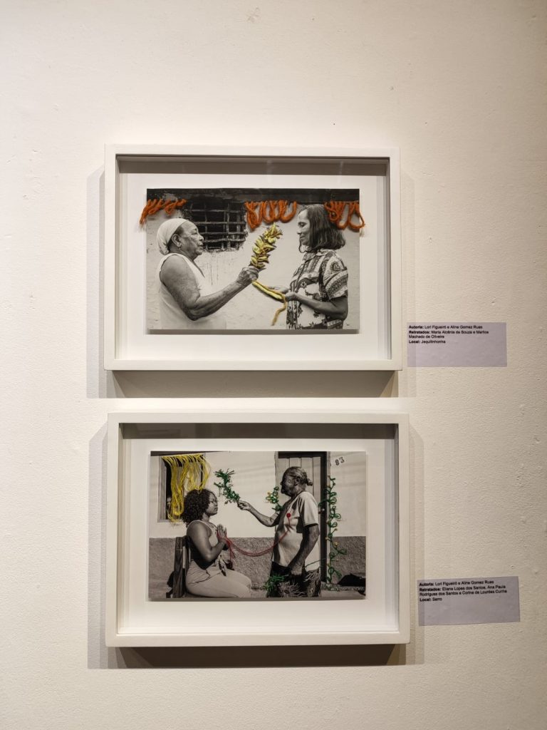 Aline Gomez, bordadeira das fotos, é nascida no quilombo Arraial dos Crioulos, em Araçuaí, e nos conta sobre sua origem, onde sua avó e mãe trouxeram essa vivência ancestral de benzeção, que compõe sua trajetória pessoal como artista: “É uma fotografia real, do que é a realidade, e a proposta do bordado vem também não interferir na fotografia. Então não é uma interferência, né. É uma junção que a gente chama de laços em oração, que é mais uma leitura do ato do benzimento em si”, explicou.