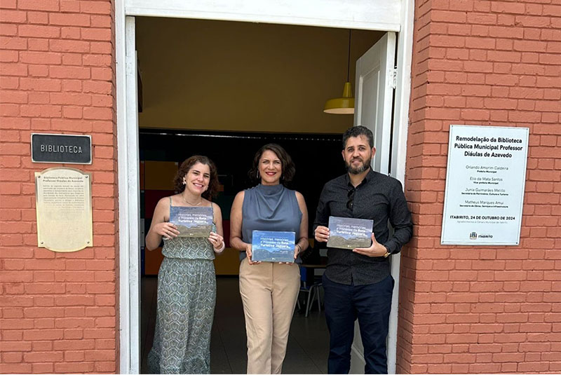 Petra Marques Sampaio, bibliotecária responsável pelo desenvolvimento e seleção de acervo da Biblioteca Pública Municipal Prof. Diáulas de Azevedo; Gilson Fernandes Antunes Martins, coordenador do projeto; e Junia Guimarães Melillo, secretária municipal de Patrimônio, Cultura e Turismo de Itabirito, MG.