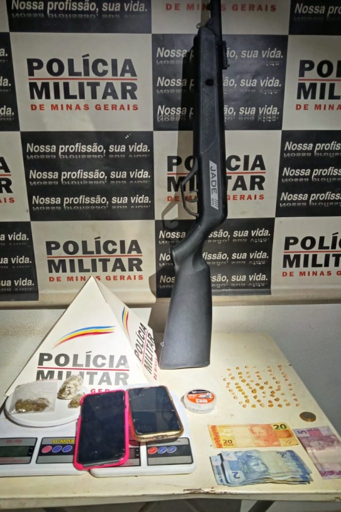 E no imóvel, foram localizadas e apreendidas: 1 (uma) espingarda do tipo ́chumbinho ́, 68 (sessenta e oito) pedras de crack, 2 (duas) buchas de maconha, 2 (duas) balanças de precisão, R$45,00