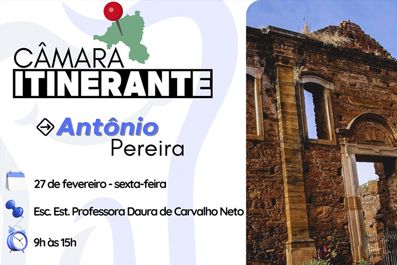 Buscando proporcionar o acesso a diversos serviços gratuitos para as comunidades do município, a Câmara de Ouro Preto, por meio do programa Câmara Itinerante, já começa a percorrer os distritos ainda neste mês! A primeira edição será realizada em Antônio Pereira, na próxima sexta-feira, 27 de fevereiro, na Escola Estadual Professora Daura de Carvalho Neto.