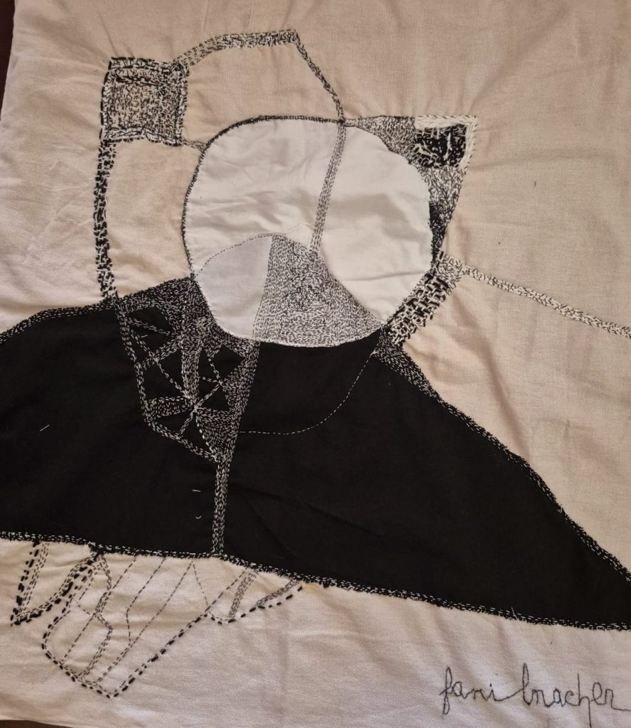 Refletindo sobre a presença simbólica da linha em sua produção, Fani a reconhece como um elemento que atravessa sua criação e seus afetos, costurando referências literárias e musicais ao seu fazer artístico. “Penso em Machado de Assis, no apólogo ‘A agulha e a linha’: ‘você fura o pano, nada mais, eu é que coso, prendo um pedaço ao outro, dou feição aos babados’. E, no mesmo fio de sentido, ouço também a música do Gilberto Gil, ‘A Linha e o Linho’, onde diz que ‘a agulha do real nas mãos da fantasia, fosse bordando, ponto a ponto, nosso dia a dia’”.