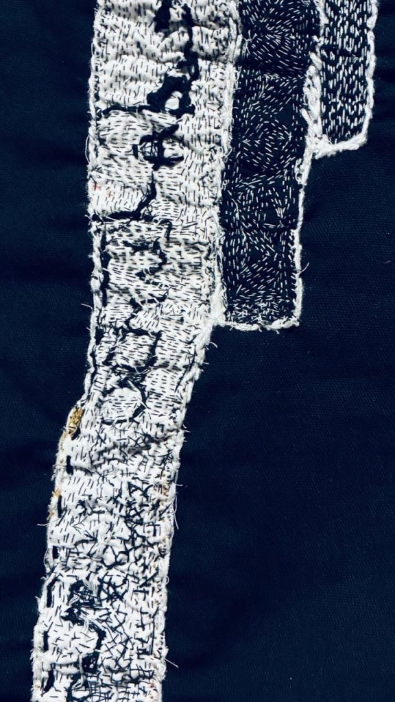 Sobre seu processo criativo, a artista afirma que sempre gostou de bordar, “não com a perfeição das bordadeiras, mas gosto de fazer os meus zigue-zagues, minhas encruzilhadas… o meu avesso do avesso e das formas inusitadas que aparecem. Meu trabalho atual, com panos, retalhos, linhas e agulhas, sei como começo e nunca sei como termino. A agulha me guia e a linha segue”.